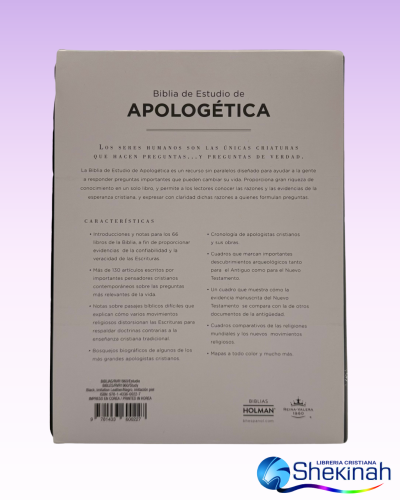 La Biblia de Estudio de Apologética es un recurso sin paralelos diseñado para ayudar a la gente a responder preguntas importantes que pueden cambiar su vida. Proporciona gran riqueza de conocimiento en un solo libro, y permite a los lectores conocer las razones y las evidencias de la esperanza cristiana, y expresar con claridad dichas razones a quienes formulan preguntas.