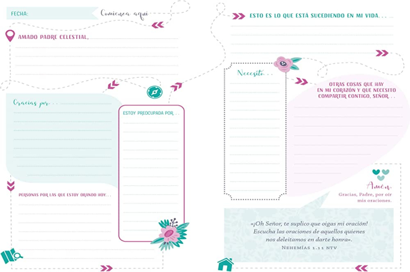 Cada página a todo color te guiará a crear tu propio mapa de oración conforme anotes tus pensamientos, ideas y listas específicas, que puedes seguir de principio a fin al hablar con Dios. (Asegúrate de registrar la fecha en cada mapa de oración para que puedas ver tus oraciones en retrospectiva y considerar cómo ha obrado Dios en tu vida.)