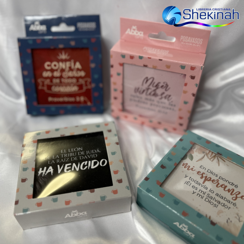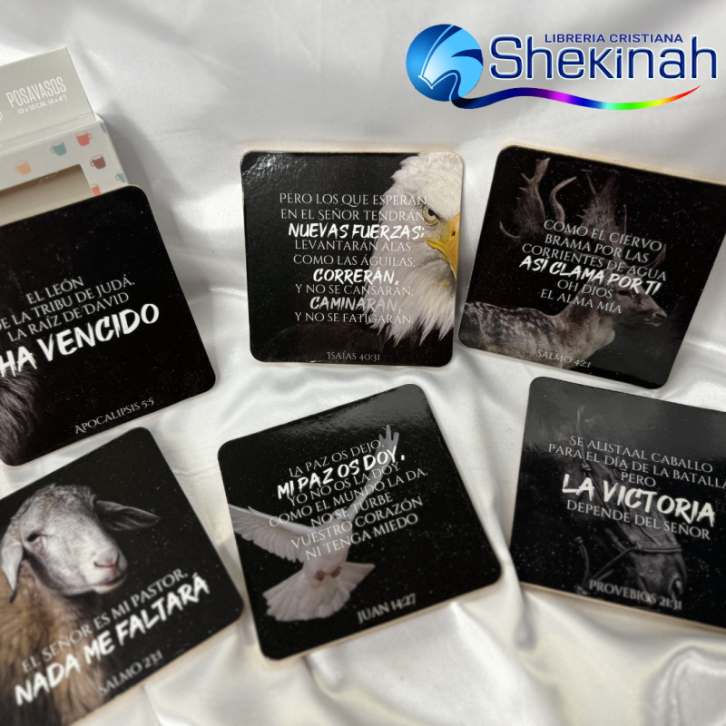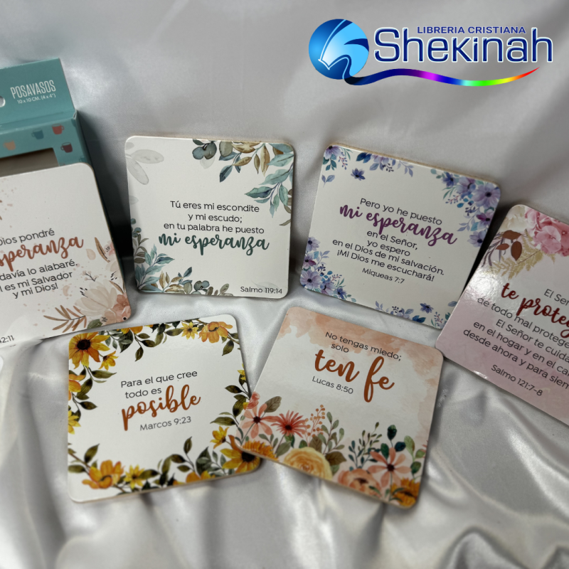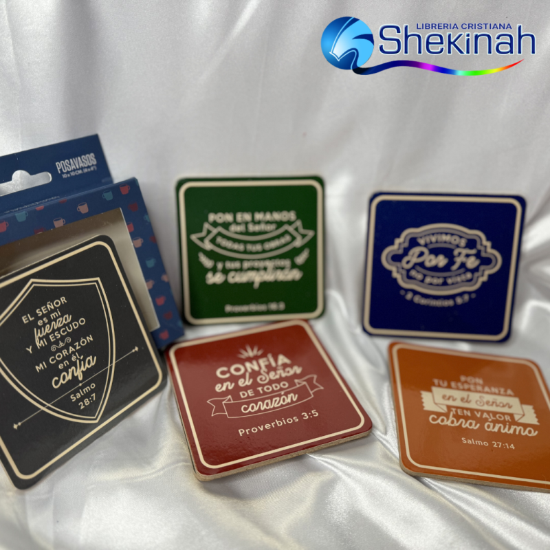 DENTRO DE CADA PAQUETE HAY 6 PORTAVASOS CON DIFERENTES VERSICULOS