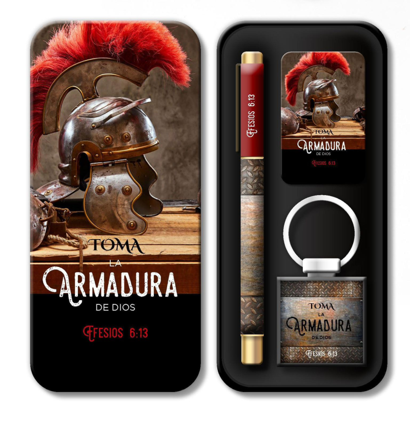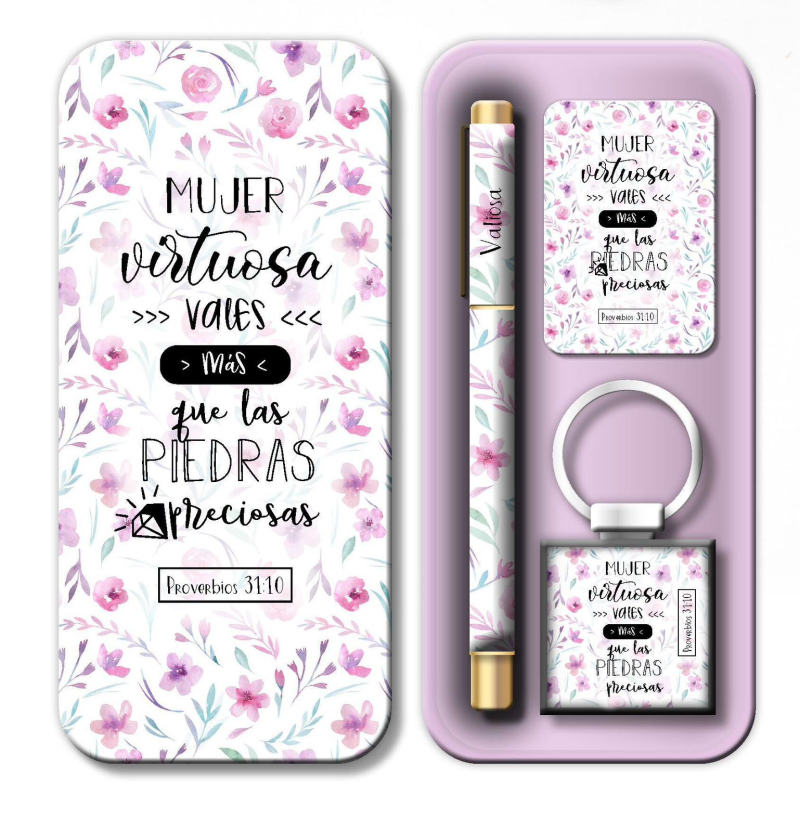 En un empaque de latita estos hermosos boligrafos con llaveros y iuna tarjeta con el versiculo!!