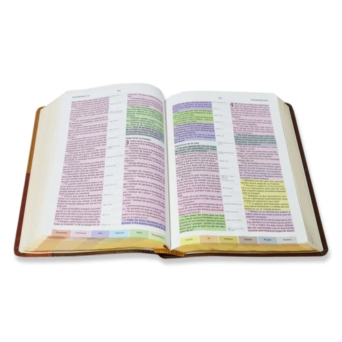 Cada versículo en su propio color de acuerdo con 12 temas clave, edición con las palabras de la Trinidad subrayadas, referencias en columna central, encabezamientos y subtítulos en el texto bíblico, 100 pasajes favoritos, concordancia, mapas a lo largo del texto bíblico y en la sección final, calendario para lectura bíblica diaria, plan para saber qué dice Dios, plan de salvación, glosario.