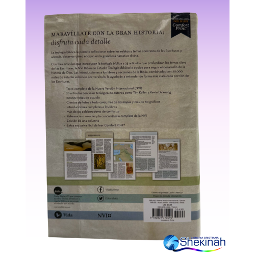 Con tres artículos que introducen la teología bíblica y 25 artículos que profundizan los temas clave de las Escrituras, la NVI Biblia de Estudio Teología Bíblica le equipa para seguir el desarrollo de la historia de Dios. Las introducciones a los libros y secciones de la Biblia, combinadas con 20.000 notas de estudio versículo por versículo, le ayudarán a entender de forma más clara cada porción de las Escrituras.
