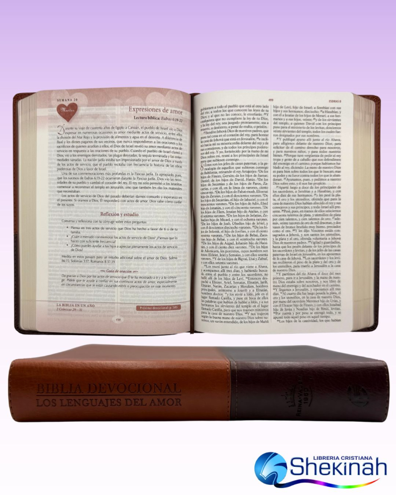La Biblia devocional, los lenguajes del amor está diseñada para hacer que la lectura de la palabra de Dios y la oración en pareja, sea divertida y significante.                                           Esta Biblia abarca numerosos temas entre los que incluye la comunicación, la expectativa, los roles, el sexo, los conflictos, el dinero, los hijos, la familia política y mucho más.