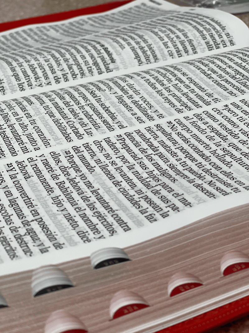 Tamaño: 185x260 mm • Con cierre • Con índice • Imitación piel de alta calidad •Diseños originales • Letra Super Grande 19 puntos •Tipografia clara •Palabras de Jesús en rojo •Notas a pie de página •Referencias cruzadas a pie de página •Concordancia amplia de 90 páginas •Concordancia adicional de personajes bíblicos Página de presentación