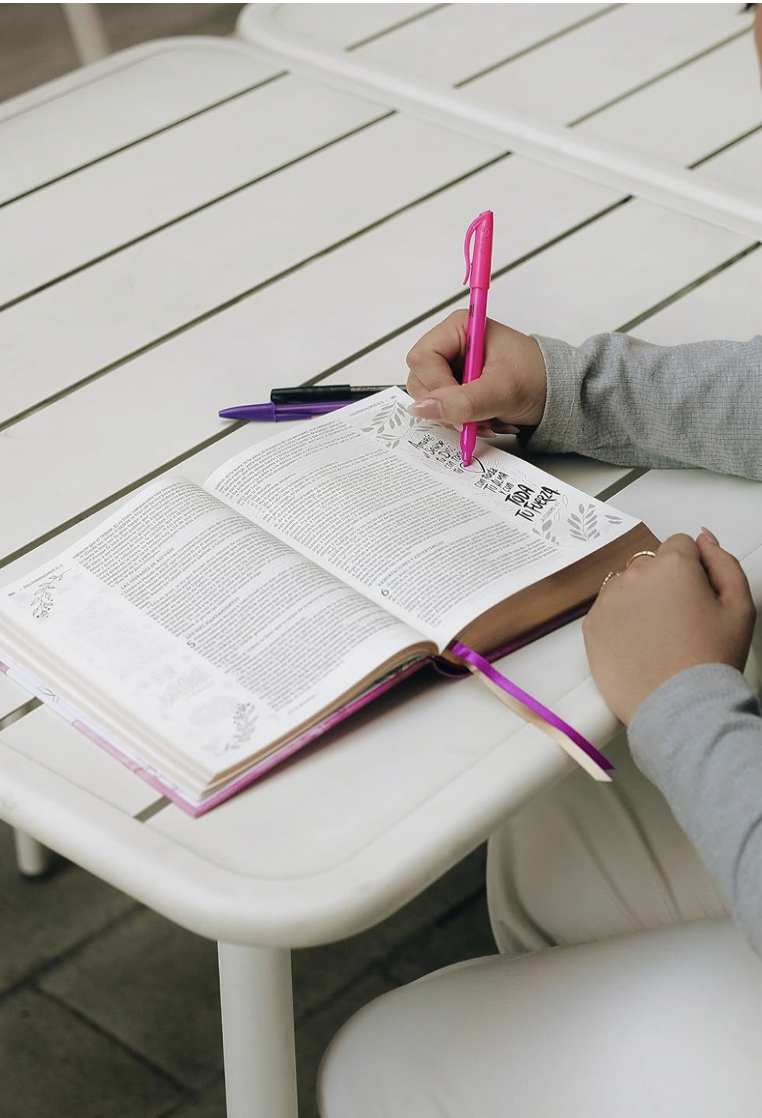Características: •NBLA •Tipografía Comfort Print™ 10 • Cubierta con un diseno impresionante pintado a mano imprimida sobre tela suave y resistente. •Canto brillante con diseño en las paginas •Márgenes amplios entre las columnas de texto, con lineas punteadas para tomar notas, dibujar, etc. •Palabras de Jesus en rojo •Dos cintas marcadoras