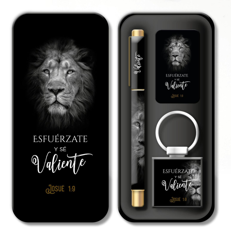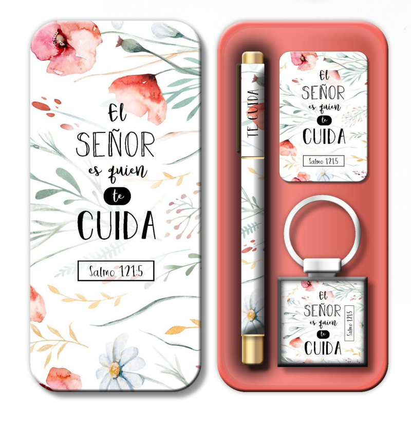 En un empaque de latita estos hermosos boligrafos con llaveros y iuna tarjeta con el versiculo!!