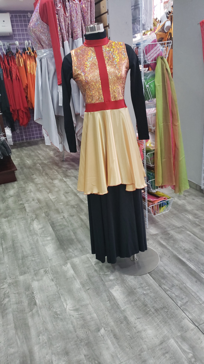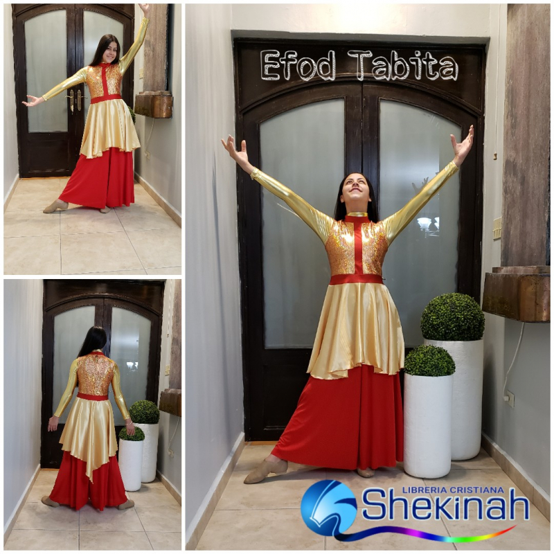 *Efod confeccionado en Licra y charmuse. Pantalón rojo palazo y leotardo oro se venden por separado.